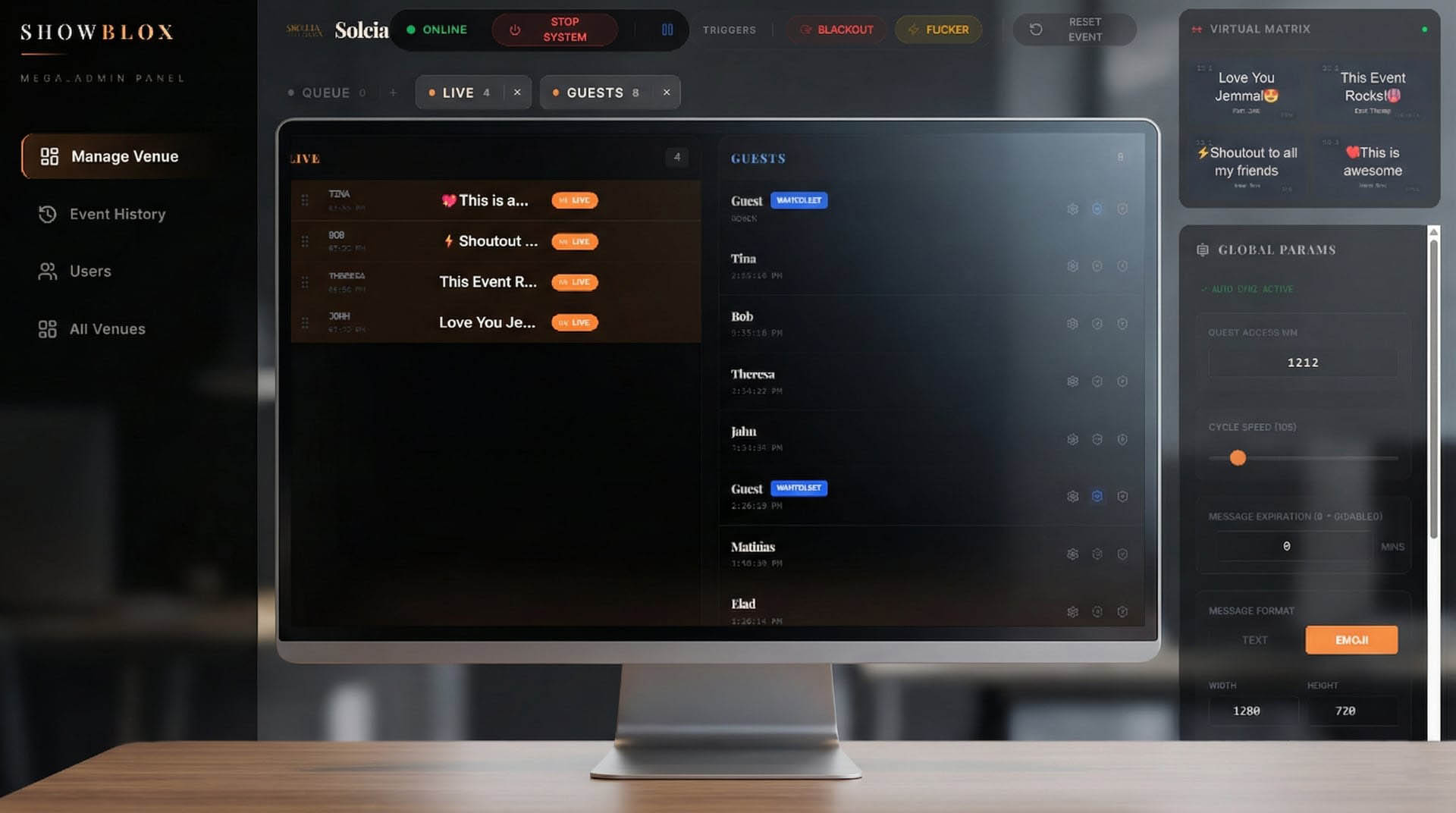 Manage live messages, trigger moments and guide the experience through a secure, professional dashboard. Designed for hosts, operators and venues.